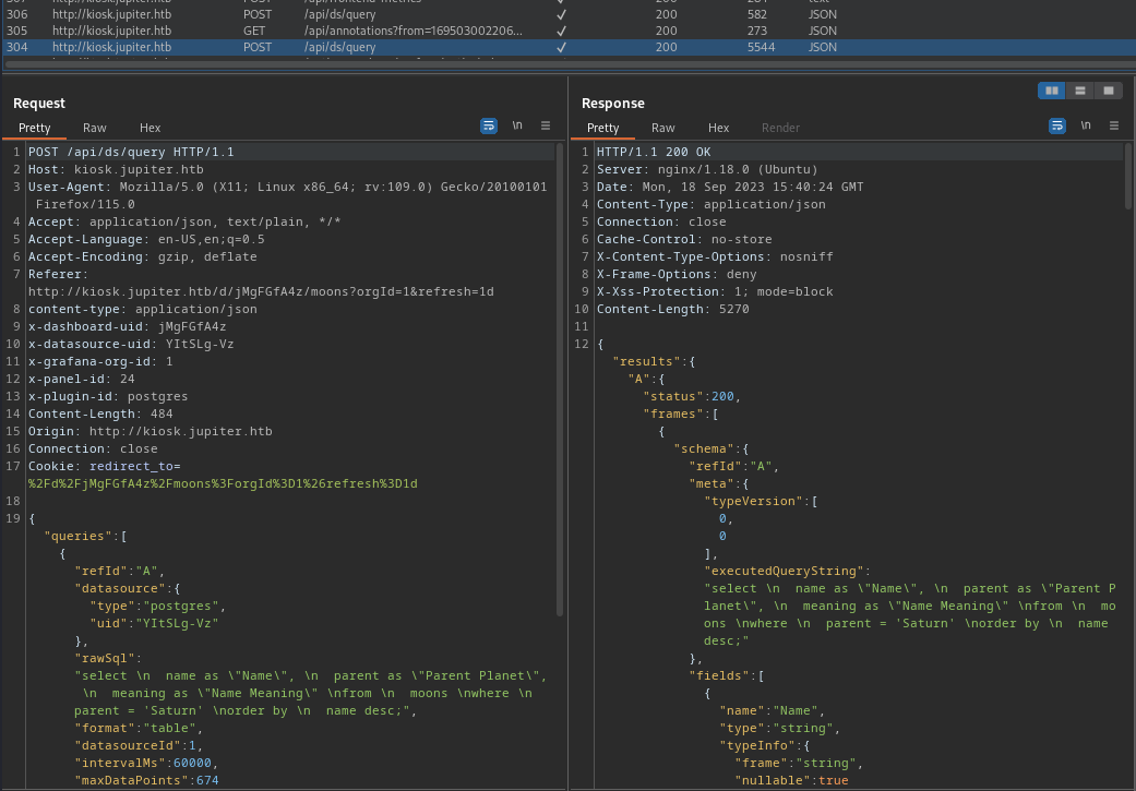 $ sudo nmap -p 22,80 -sC -sV -oA scans/tcp_scripts jupiter.htb...PORT STATE SERVICE VERSION22/tcp open ssh OpenSSH 8.9p1 Ubuntu 3ubuntu0.1 (Ubuntu Linux; protocol 2.0)...80/tcp open http nginx 1.18.0 (Ubuntu)|_http-title: Home | Jupiter|_http-server-header: nginx/1.18.0 (Ubuntu)