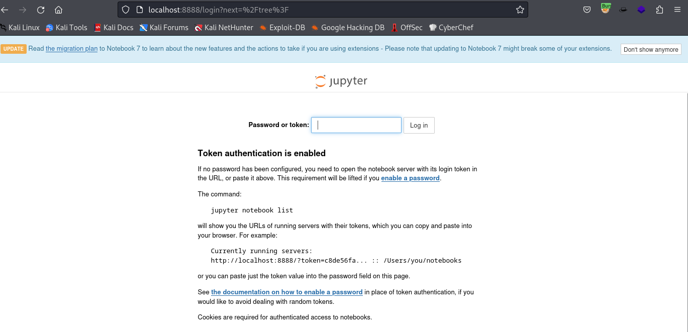 Now, access Jupyter on the host machine at http://localhost:8888/. The landing page displays a message prompting for a password or token: